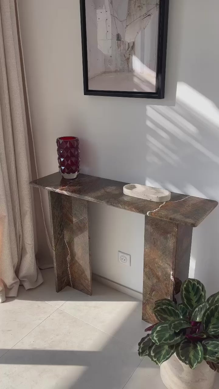 Le marbre Green Forest, originaire d’Inde, est reconnu pour sa texture dynamique et ses contrastes naturels qui évoquent les nervures d’un bois ancien ou les strates d’un paysage terrestre typique d'une forêt. Cette console devient ainsi une véritable oeuvre, à la fois brute et raffinée.