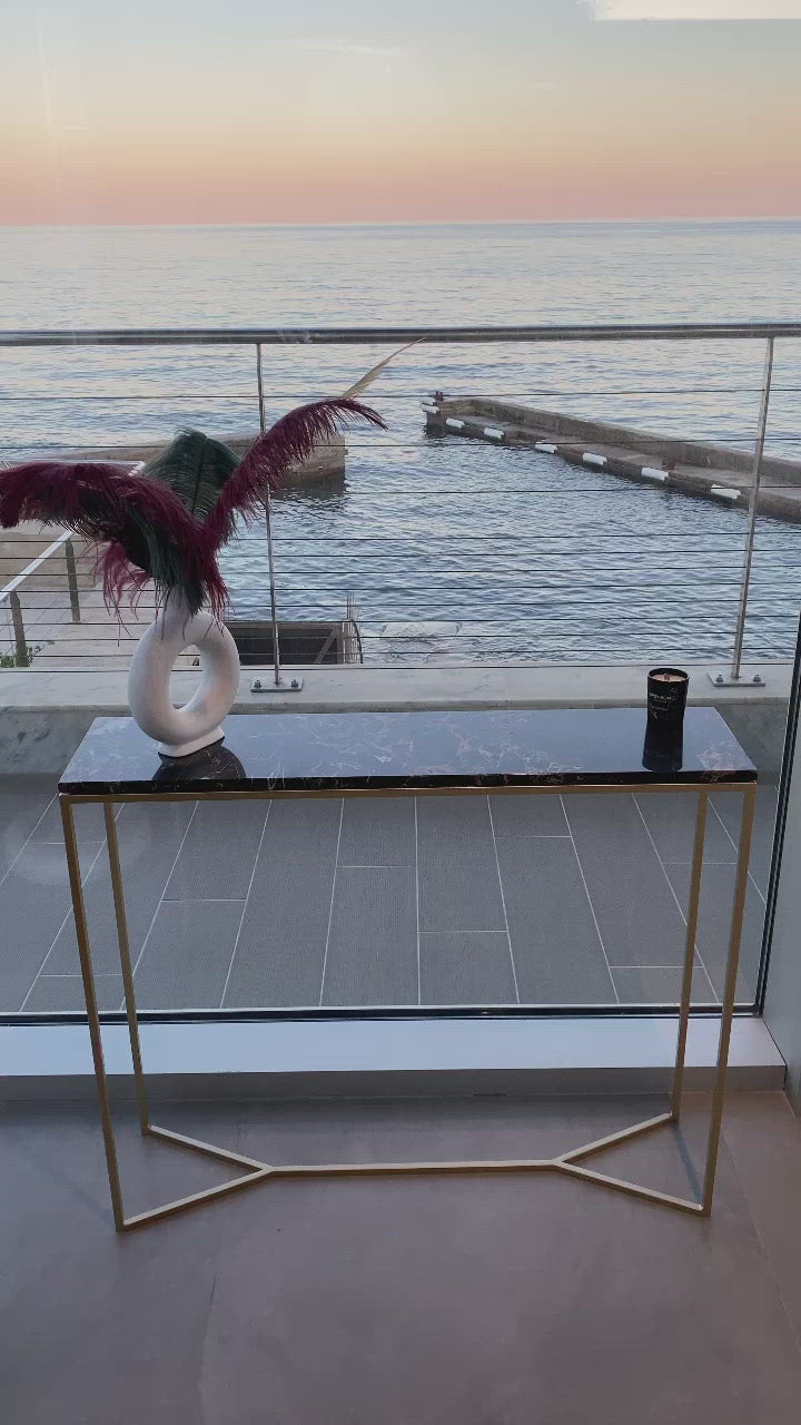 Console rectangulaire métal noir ou doré et plateau marbre de 2cm d’épaisseur. Fine et étroite, elle trouvera facilement sa place dans votre intérieur.