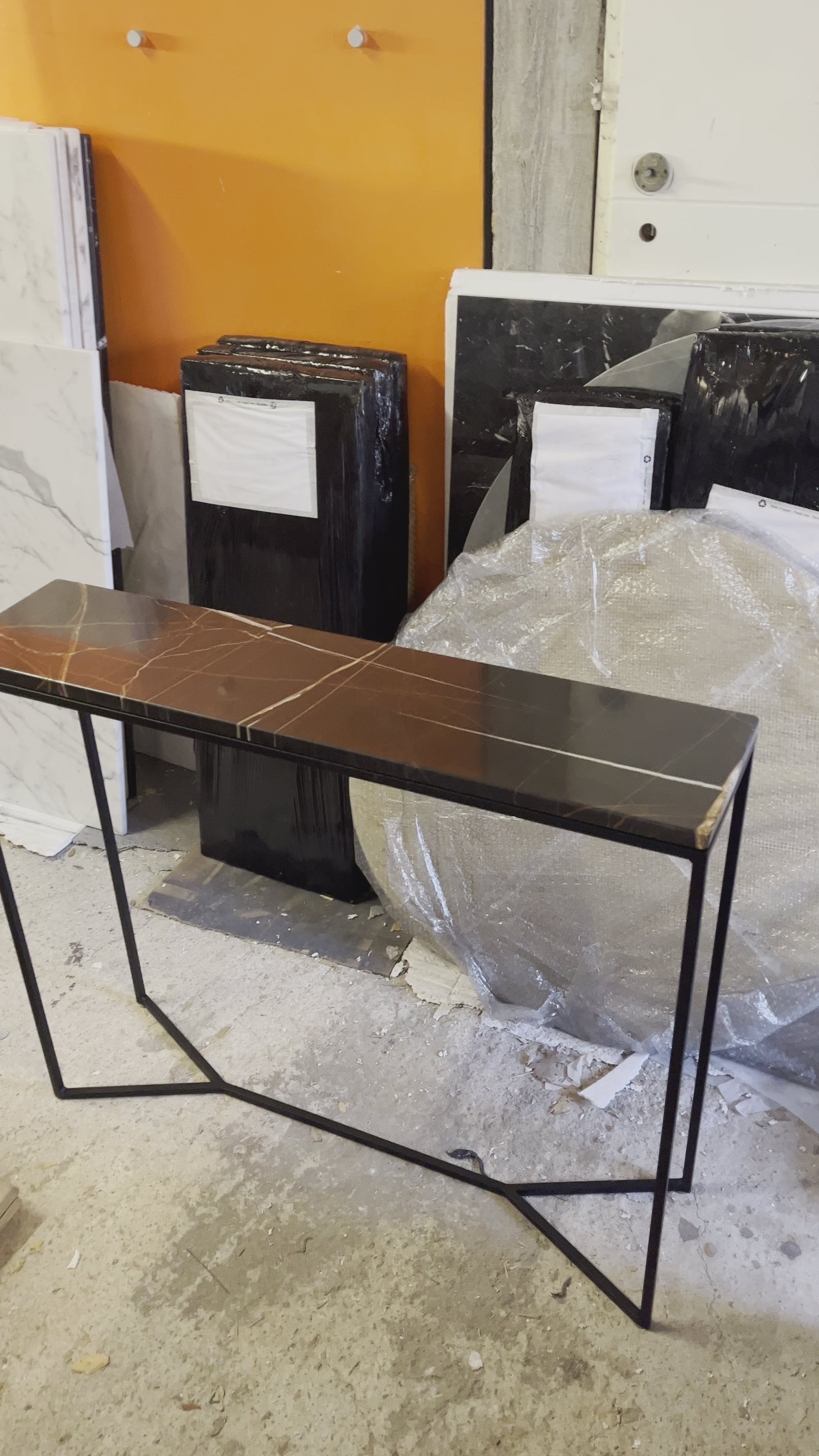 Console rectangulaire métal noir ou doré et plateau marbre de 2cm d’épaisseur. Fine et étroite, elle trouvera facilement sa place dans votre intérieur.