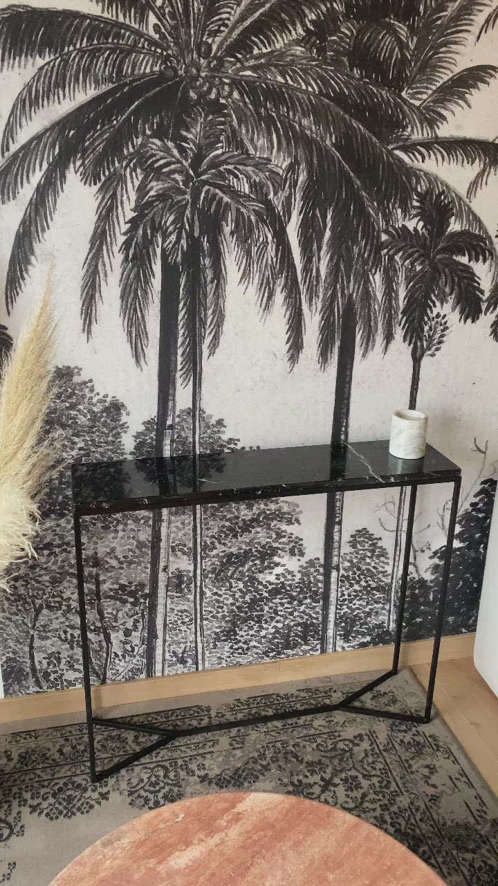 Console rectangulaire métal noir ou doré et plateau marbre de 2cm d’épaisseur. Fine et étroite, elle trouvera facilement sa place dans votre intérieur.