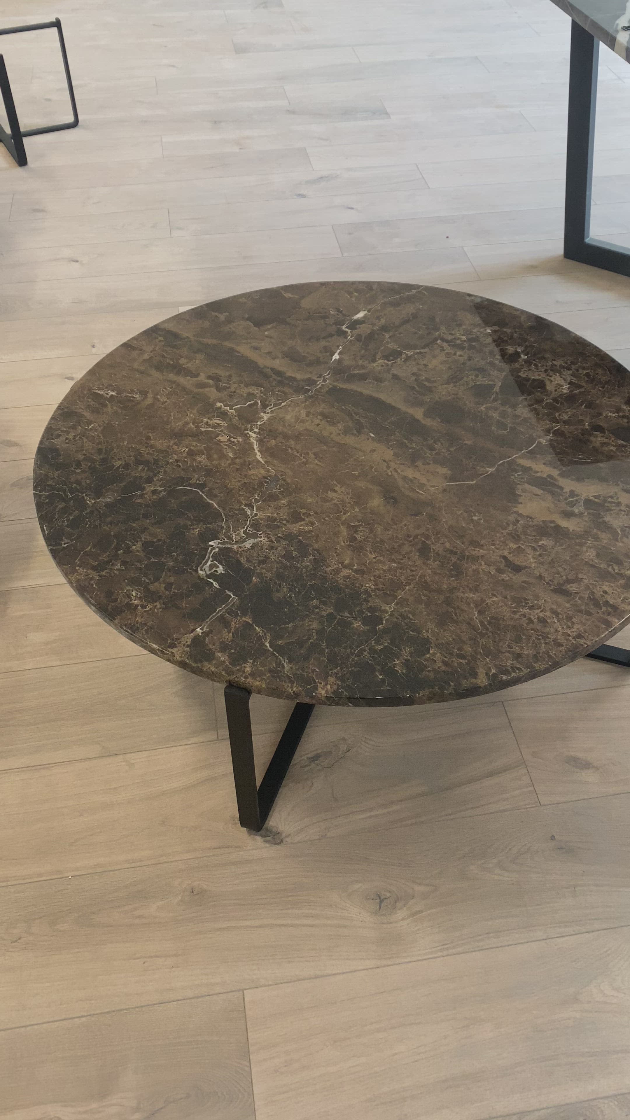 Raffinement et simplicité assuré avec la combinaison d'un plateau en marbre, une pierre noble, douce et solide accompagné d'une structure en fer plat.
